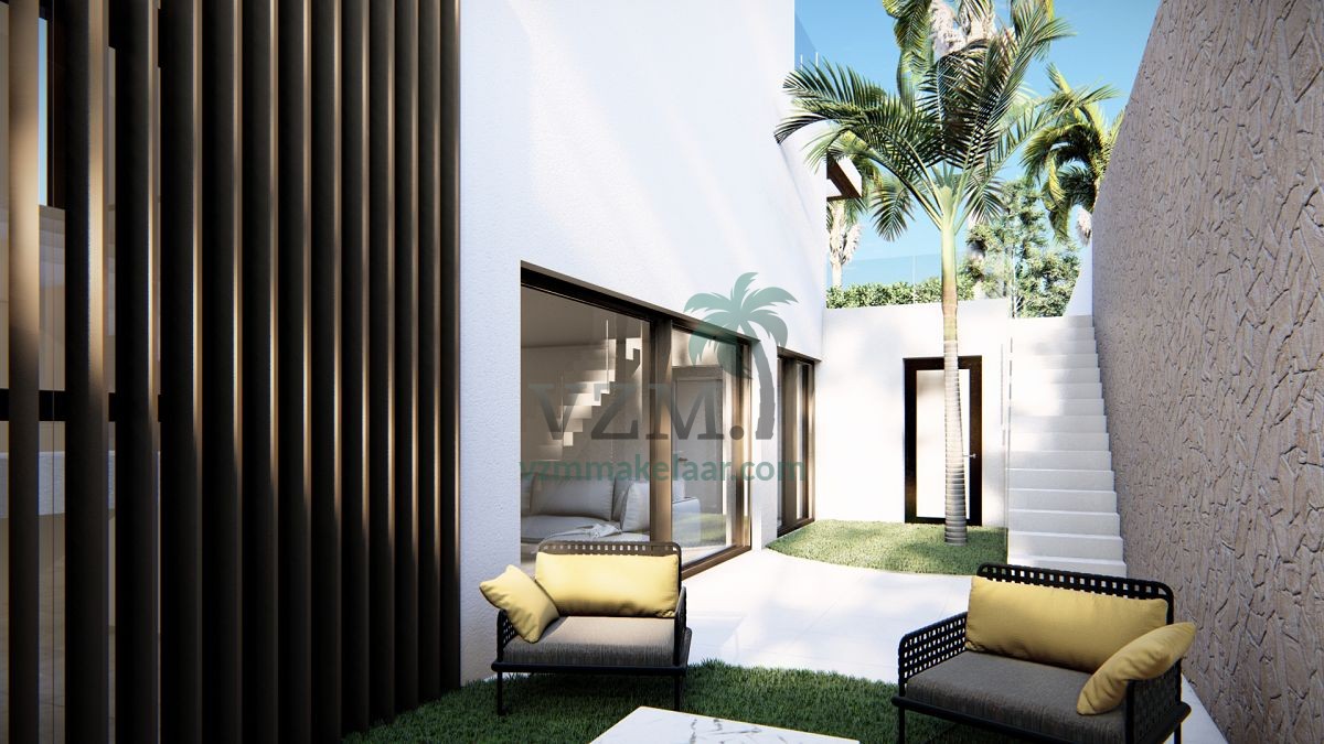 Prachtige luxe villa aan zee in La Zenia op een perceel van 590 m2 met 3 slaapkamers, 3 badkamers, een zwembad met lounchegedeelte en ledverlichting, een kelder en een groot terras op de eerste verdieping.
